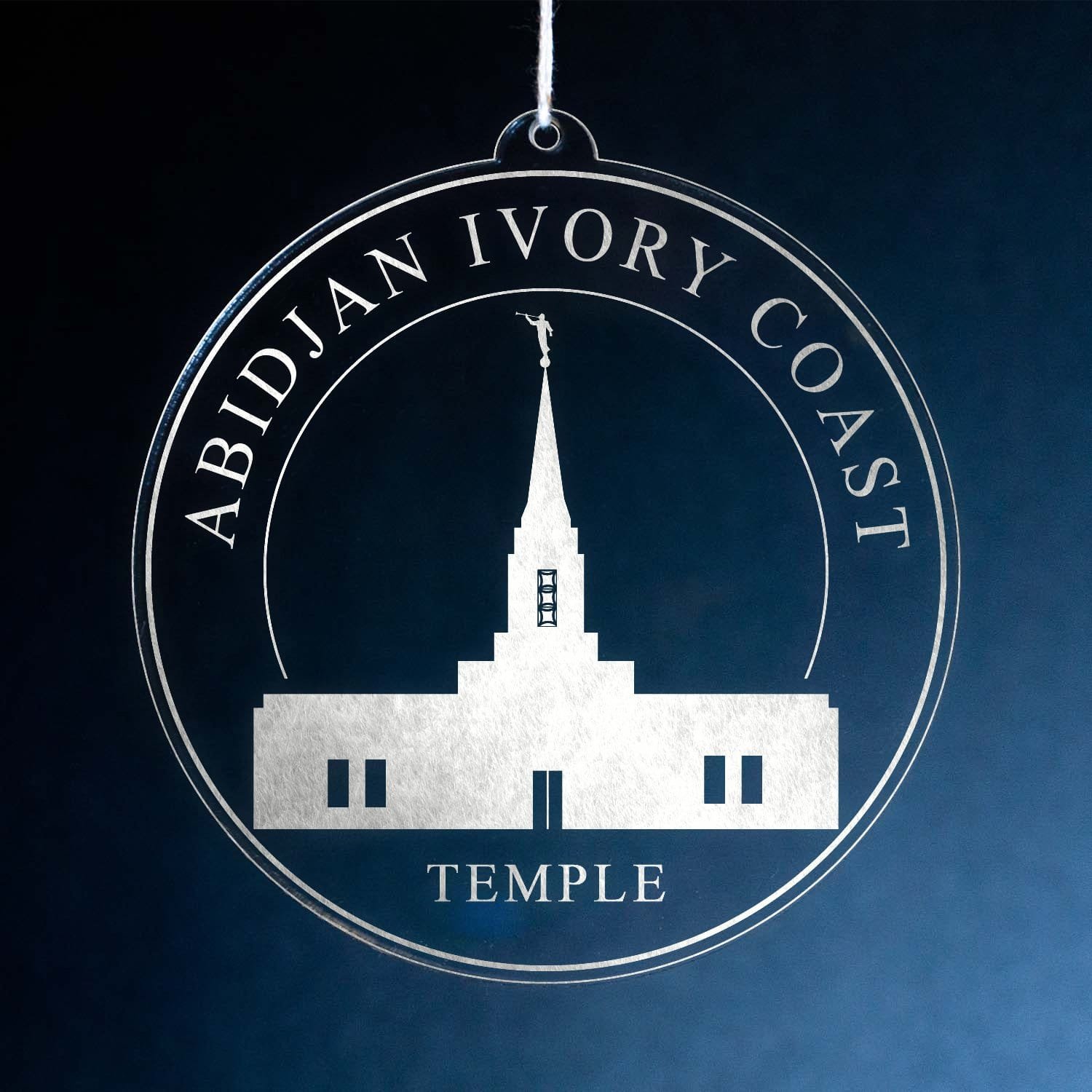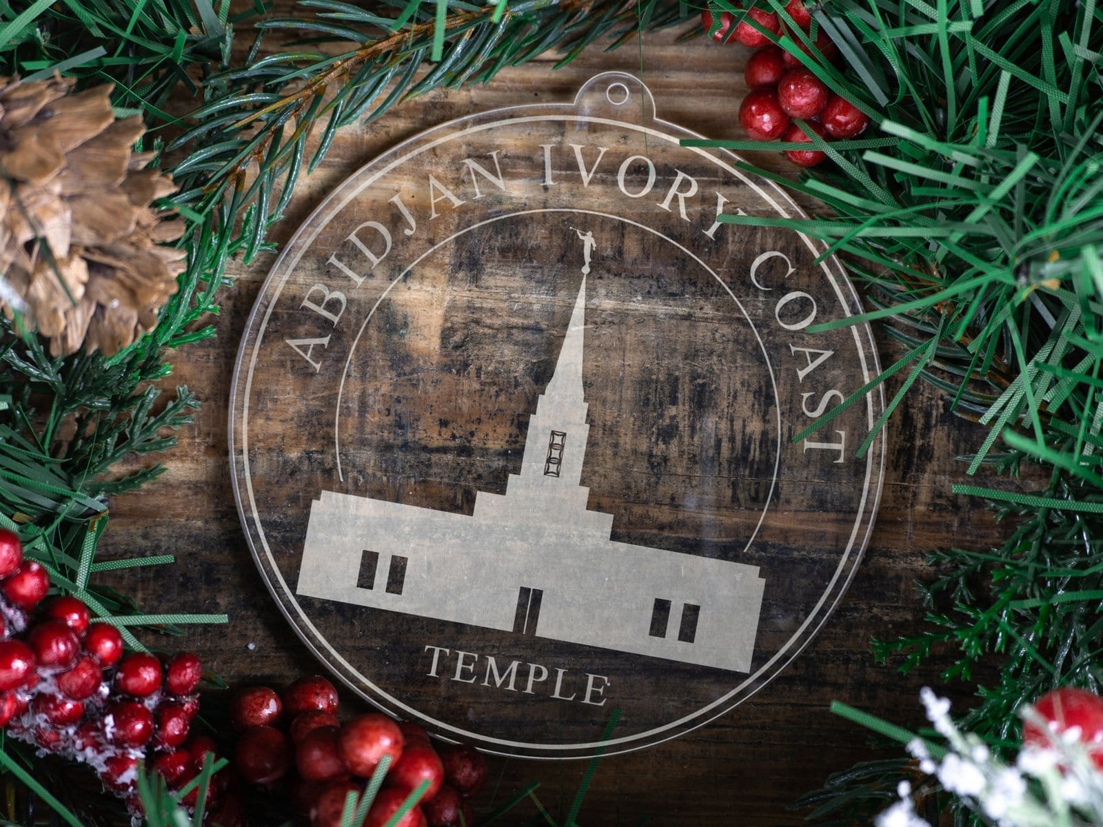 Made out of a lightweight and very durable transparent acrylic, this ornament will not weigh your tree down and can definitely withstand being dropped by the little ones should they get too curious around the tree. The acrylic is cut into a 4 inch circle and then laser etched with the name of the temple and a graphic depicting an artistic representation of the Abidjan Ivory Coast Temple.