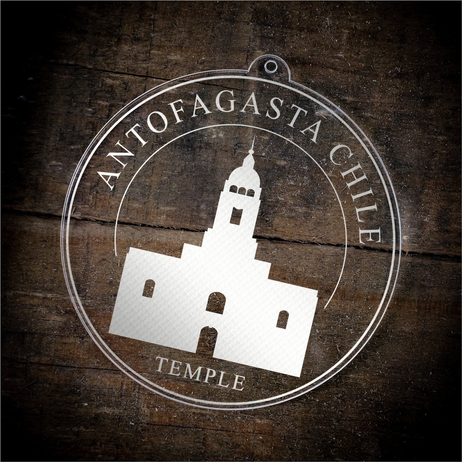 Made out of a lightweight and very durable transparent acrylic, this ornament will not weigh your tree down and can definitely withstand being dropped by the little ones should they get too curious around the tree. The acrylic is cut into a 4 inch circle and then laser etched with the name of the temple and a graphic depicting an artistic representation of the Antofagasta Chile Temple.