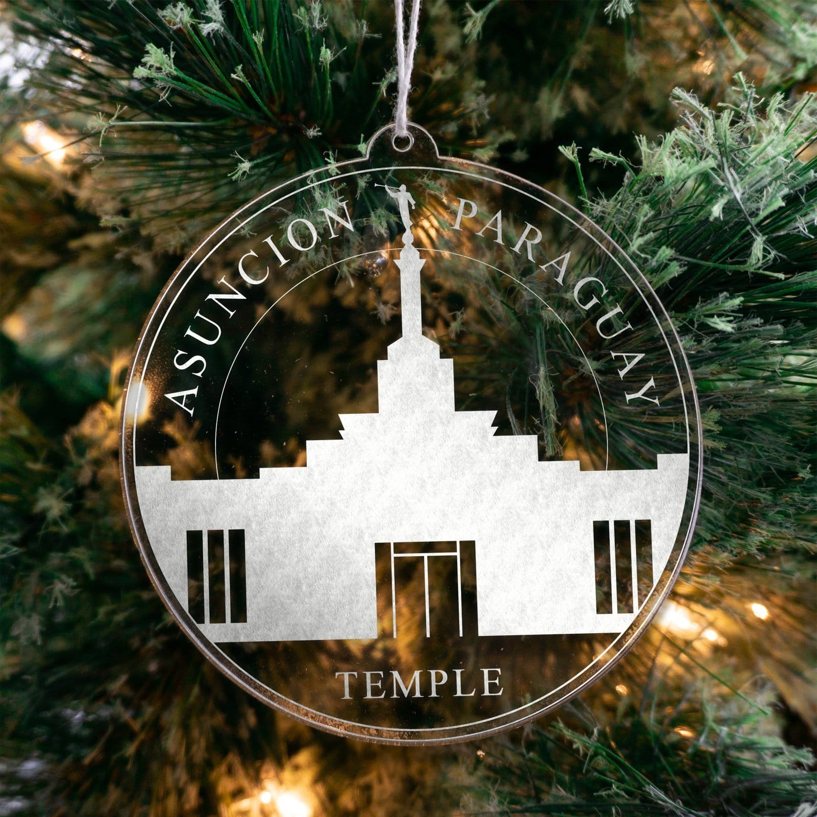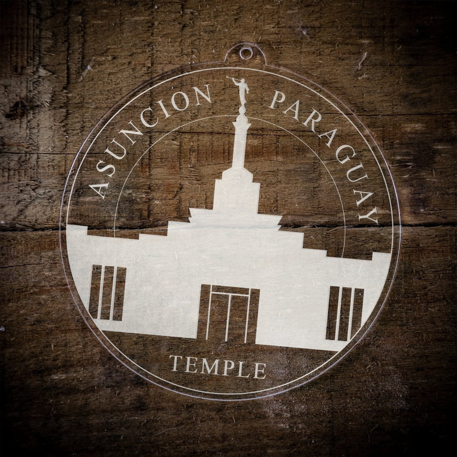 Made out of a lightweight and very durable transparent acrylic, this ornament will not weigh your tree down and can definitely withstand being dropped by the little ones should they get too curious around the tree.  The acrylic is cut into a 4 inch circle and then laser etched with the name of the temple and a graphic depicting an artistic representation of the Asuncion Paraguay Temple.