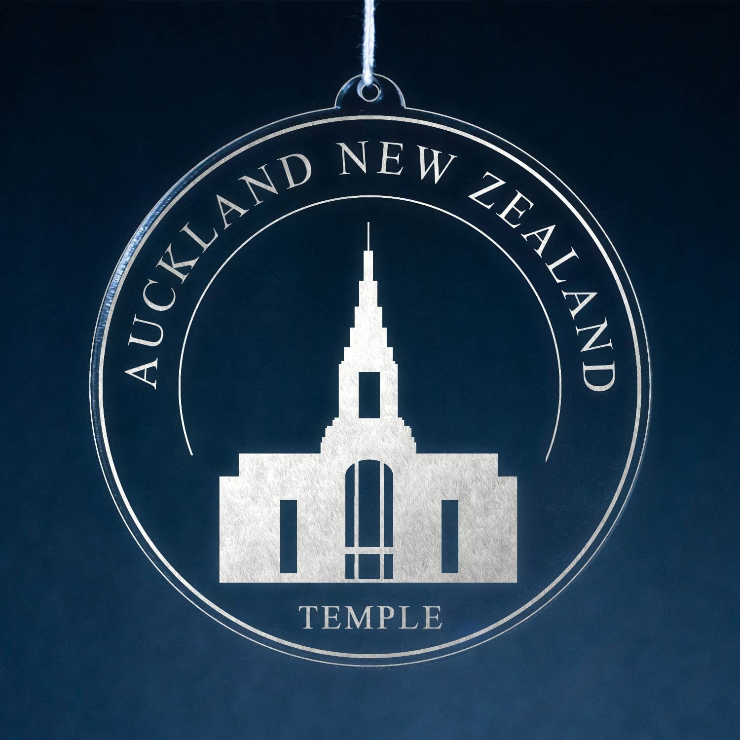 Made out of a lightweight and very durable transparent acrylic, this ornament will not weigh your tree down and can definitely withstand being dropped by the little ones should they get too curious around the tree. The acrylic is cut into a 4 inch circle and then laser etched with the name of the temple and a graphic depicting an artistic representation of the Auckland New Zealand Temple.