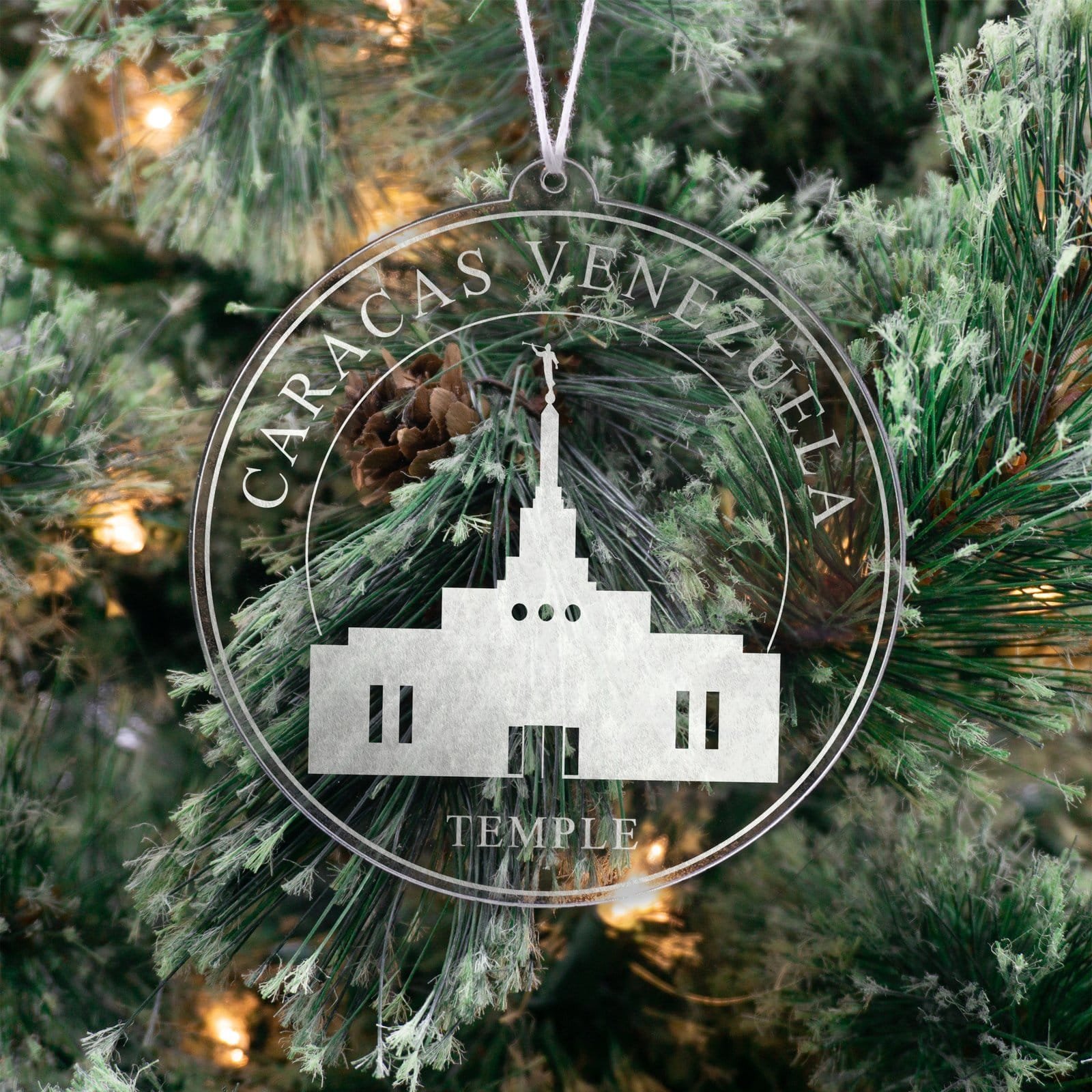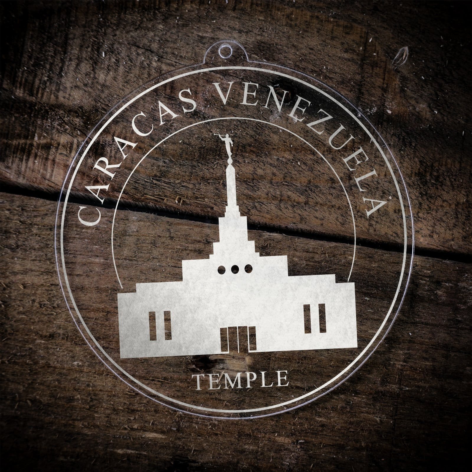 Made out of a lightweight and very durable transparent acrylic, this ornament will not weigh your tree down and can definitely withstand being dropped by the little ones should they get too curious around the tree. The acrylic is cut into a 4 inch circle and then laser etched with the name of the temple and a graphic depicting an artistic representation of the Caracas Venezuela Temple.