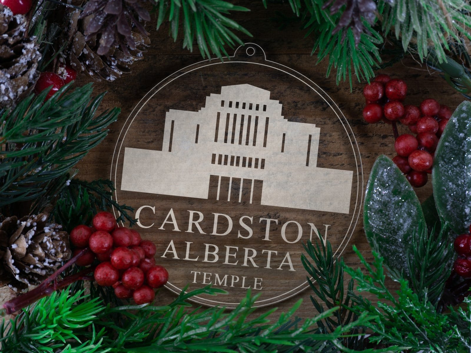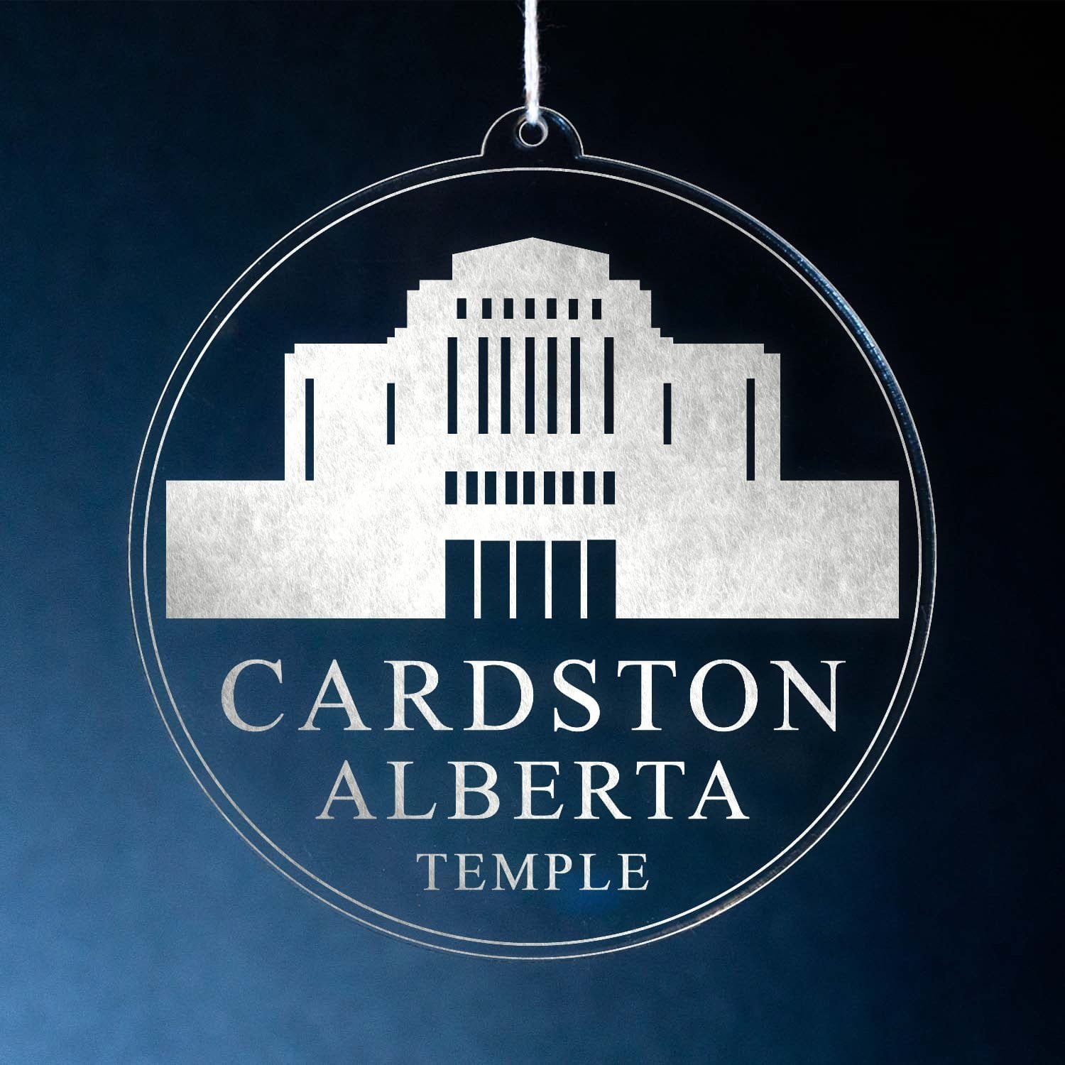 Made out of a lightweight and very durable transparent acrylic, this ornament will not weigh your tree down and can definitely withstand being dropped by the little ones should they get too curious around the tree. The acrylic is cut into a 4 inch circle and then laser etched with the name of the temple and a graphic depicting an artistic representation of the Cardston Alberta Temple.