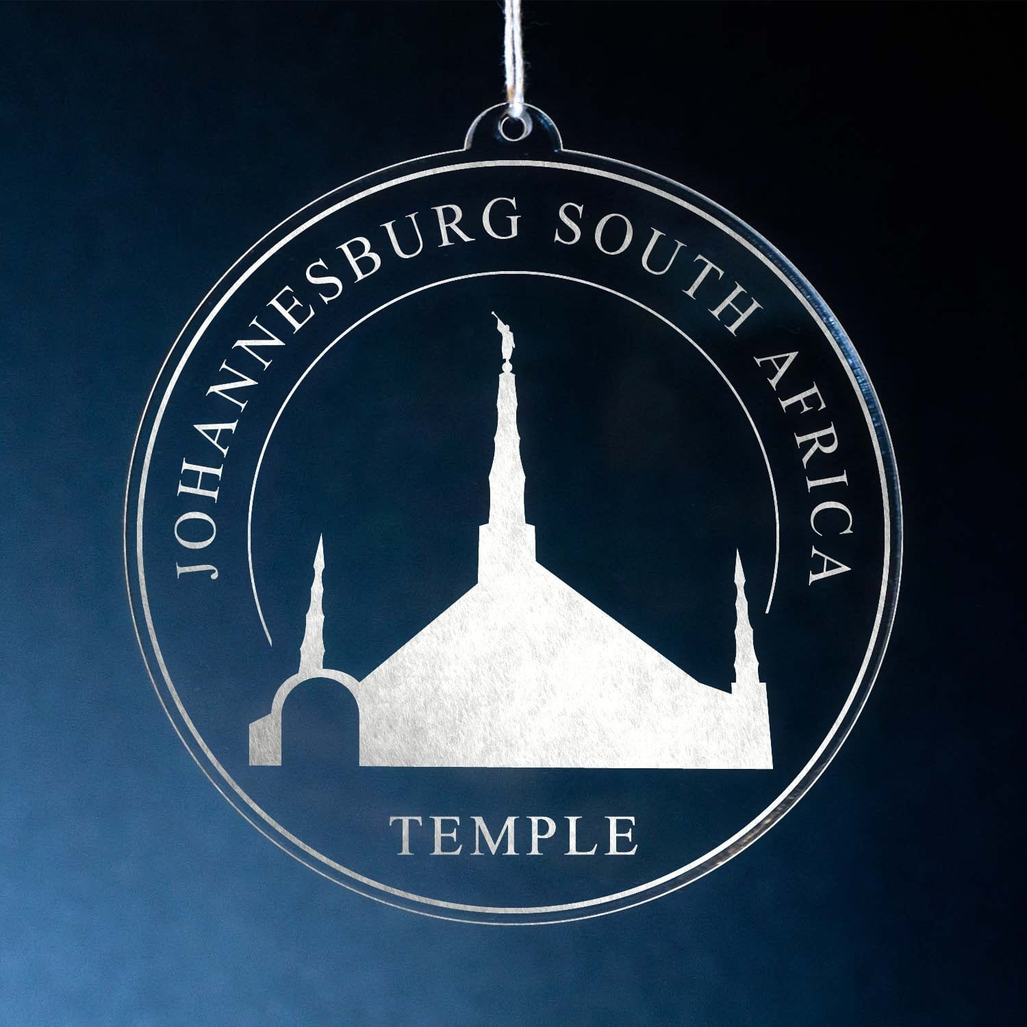 Made out of a lightweight and very durable transparent acrylic, this ornament will not weigh your tree down and can definitely withstand being dropped by the little ones should they get too curious around the tree. The acrylic is cut into a 4 inch circle and then laser etched with the name of the temple and a graphic depicting an artistic representation of the Johannesburg South Africa Temple.