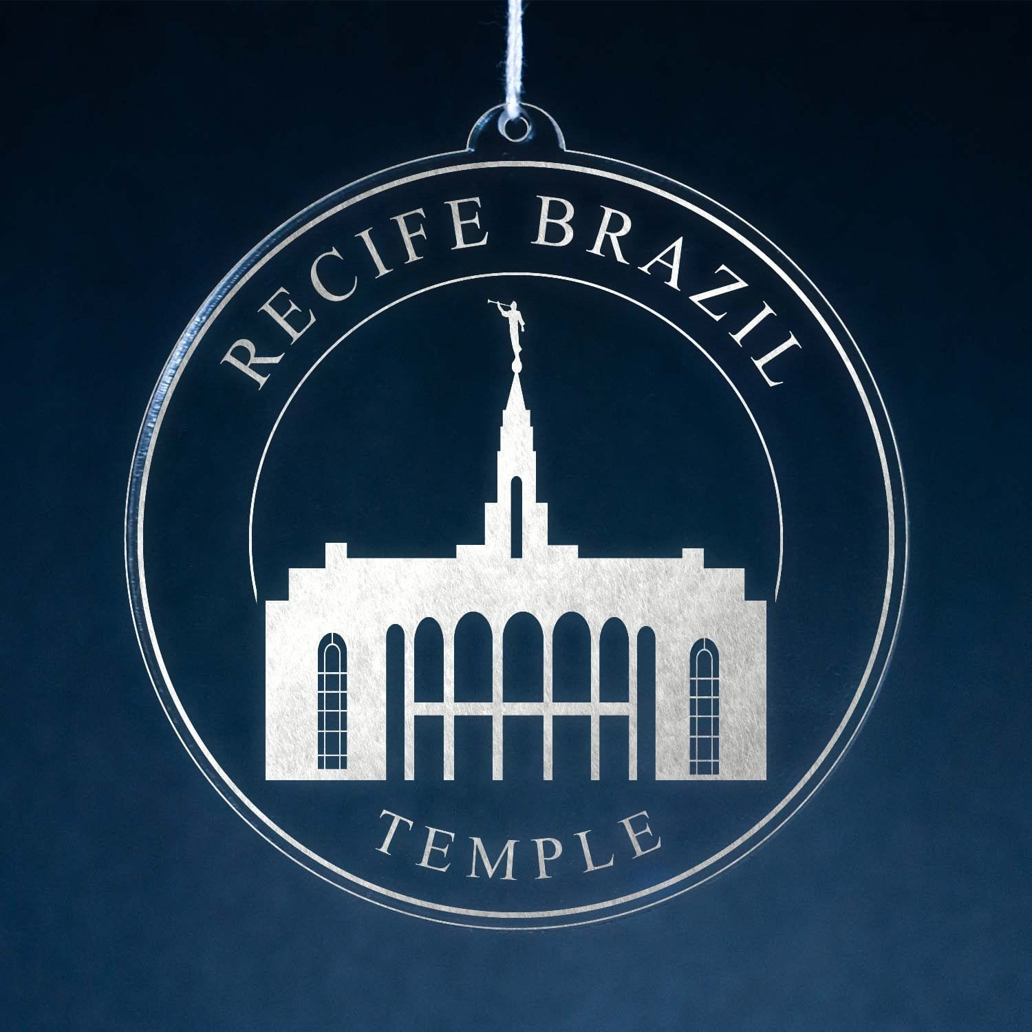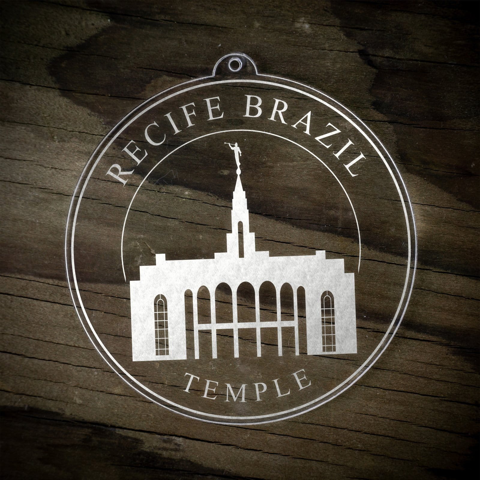 Made out of a lightweight and very durable transparent acrylic, this ornament will not weigh your tree down and can definitely withstand being dropped by the little ones should they get too curious around the tree. The acrylic is cut into a 4 inch circle and then laser etched with the name of the temple and a graphic depicting an artistic representation of the Recife Brazil Temple.
