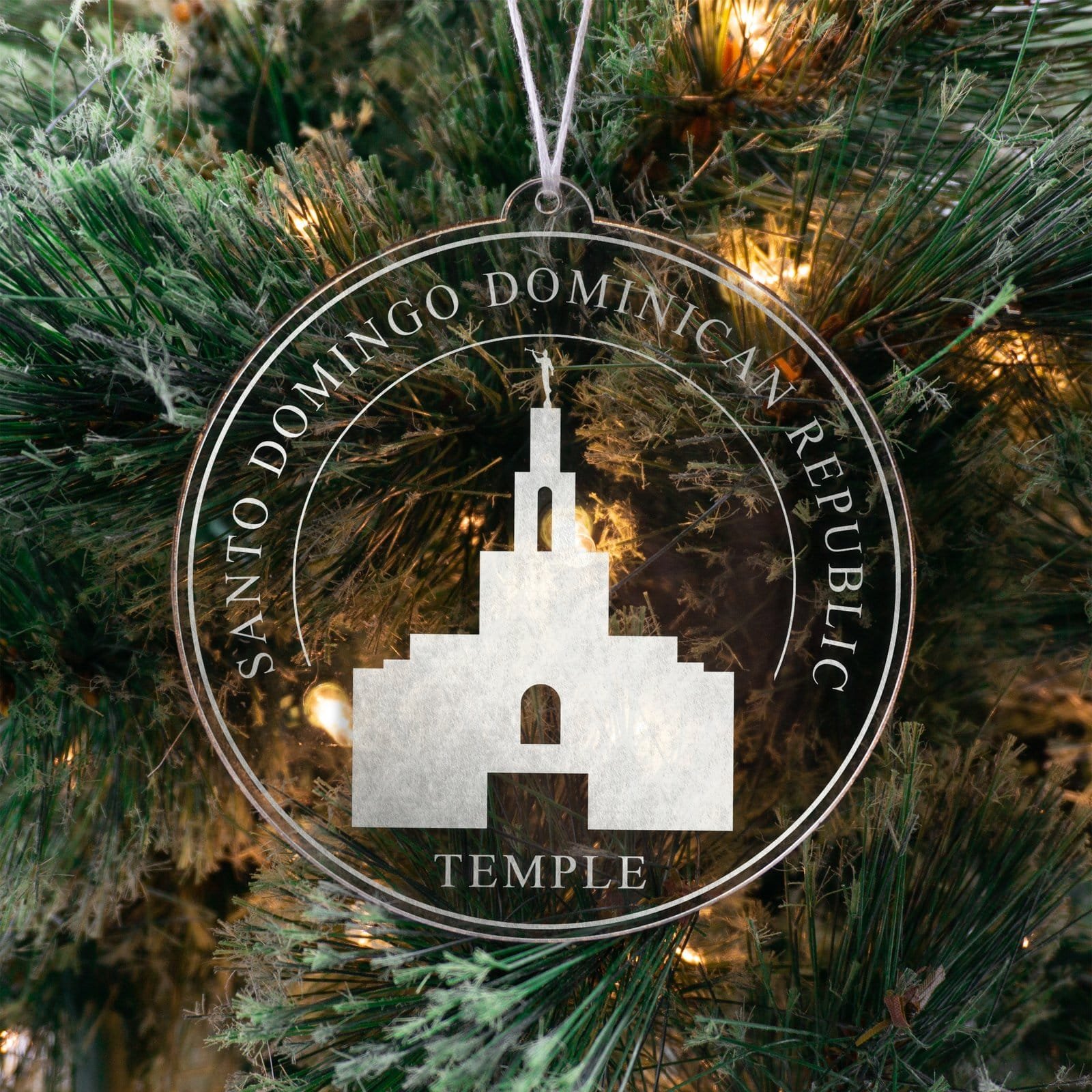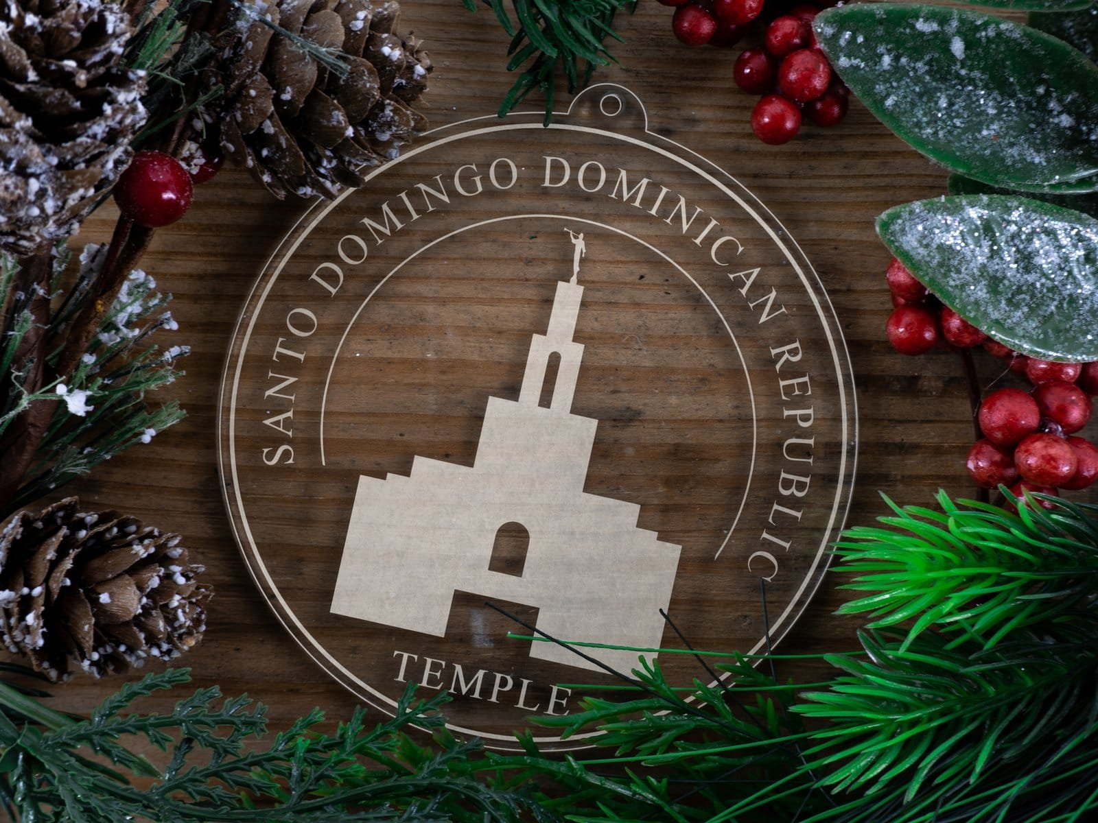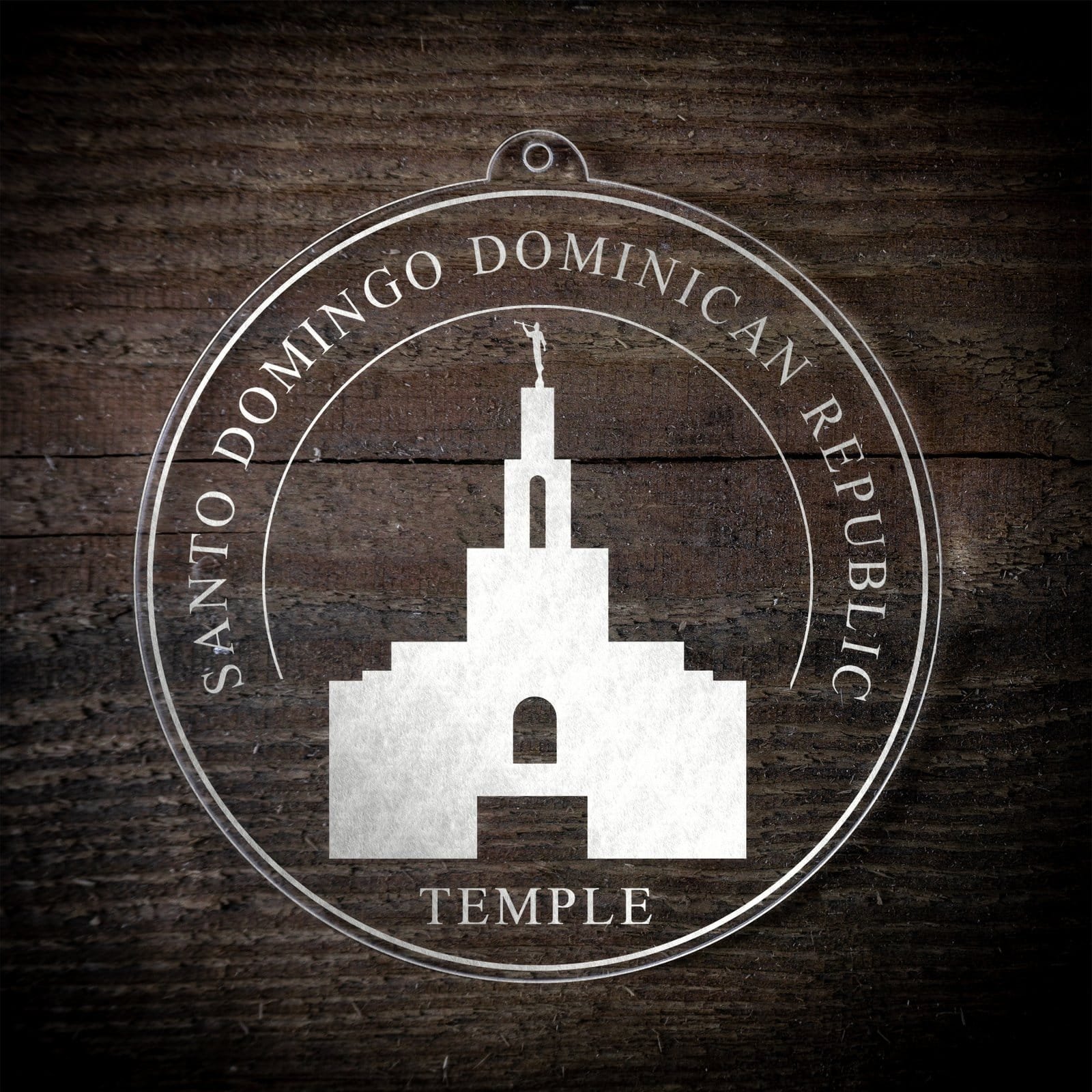Made out of a lightweight and very durable transparent acrylic, this ornament will not weigh your tree down and can definitely withstand being dropped by the little ones should they get too curious around the tree. The acrylic is cut into a 4 inch circle and then laser etched with the name of the temple and a graphic depicting an artistic representation of the Santo Domingo Dominican Republic Temple.