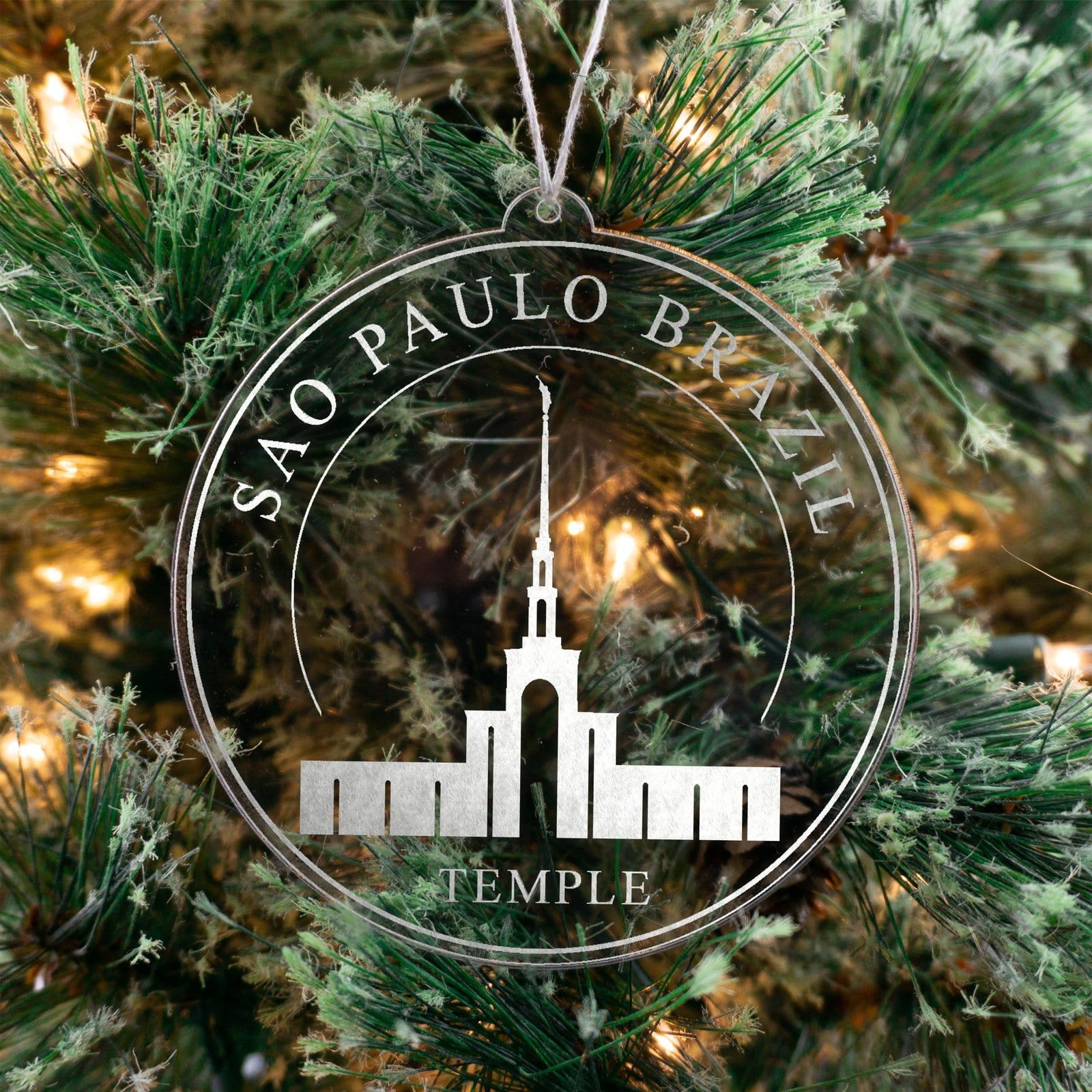 Made out of a lightweight and very durable transparent acrylic, this ornament will not weigh your tree down and can definitely withstand being dropped by the little ones should they get too curious around the tree. The acrylic is cut into a 4 inch circle and then laser etched with the name of the temple and a graphic depicting an artistic representation of the Sao Paulo Brazil Temple.