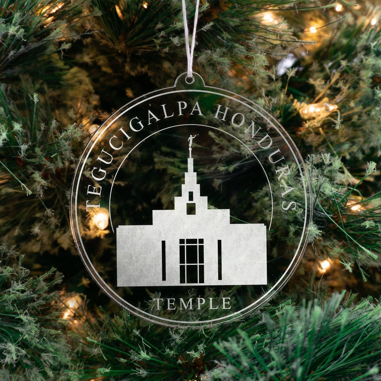 Made out of a lightweight and very durable transparent acrylic, this ornament will not weigh your tree down and can definitely withstand being dropped by the little ones should they get too curious around the tree.  The acrylic is cut into a 4 inch circle and then laser etched with the name of the temple and a graphic depicting an artistic representation of the Tegucigalpa Honduras Temple.
