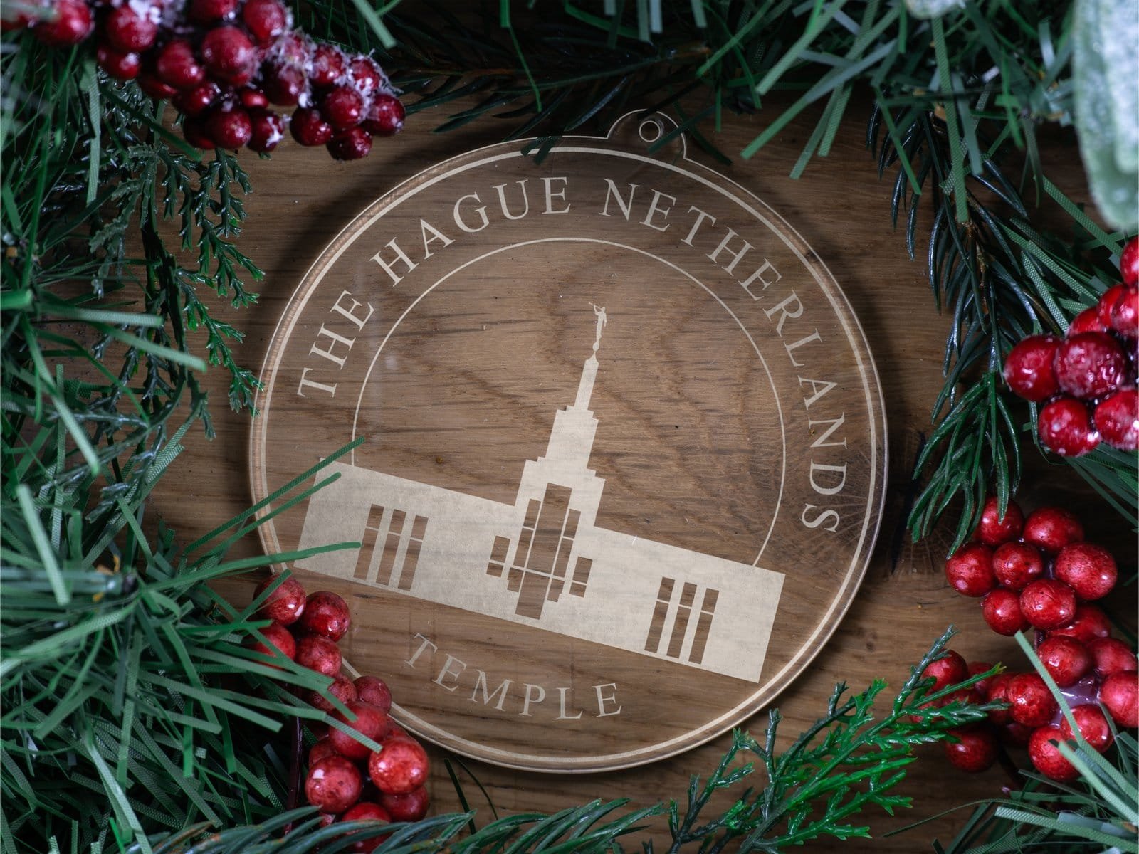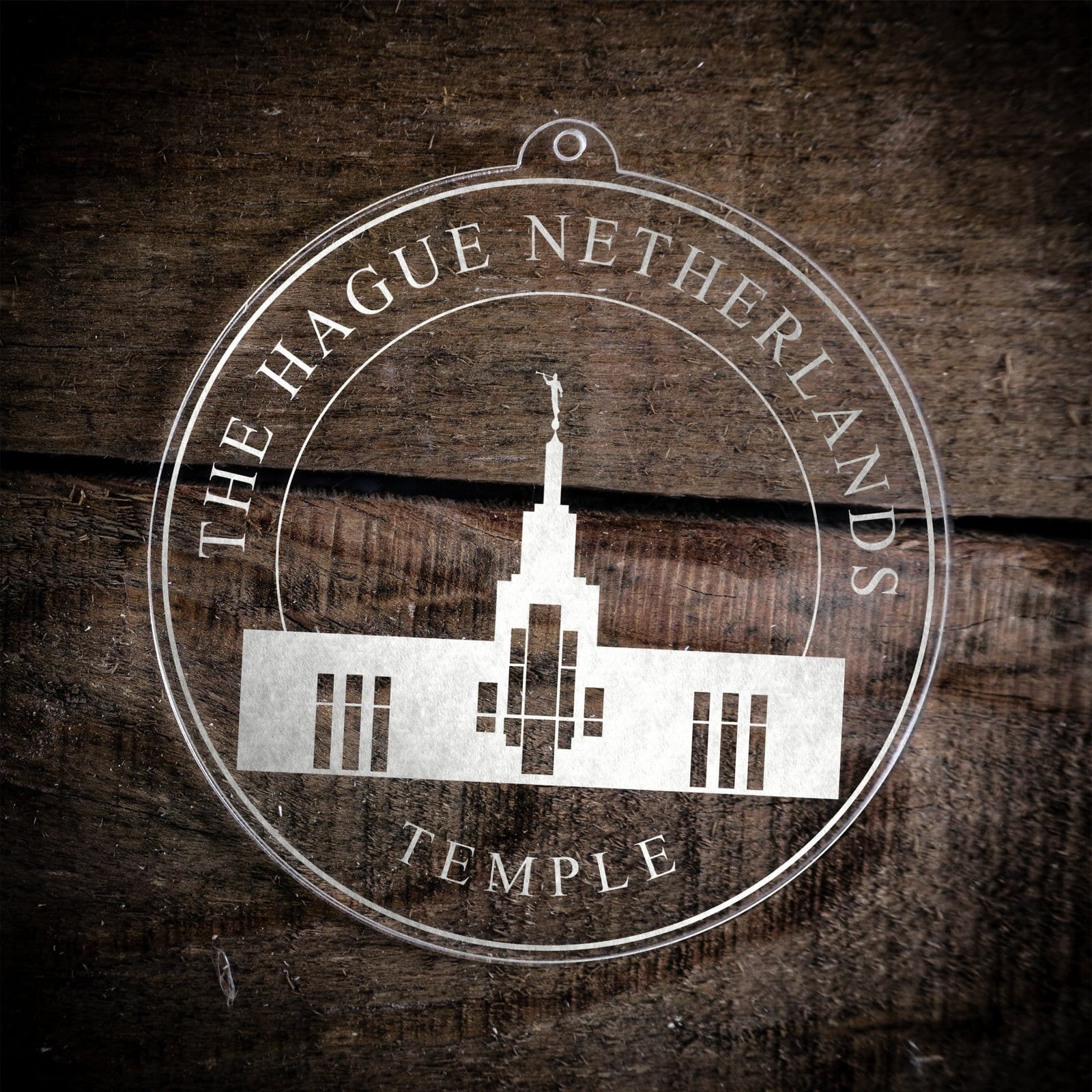 Made out of a lightweight and very durable transparent acrylic, this ornament will not weigh your tree down and can definitely withstand being dropped by the little ones should they get too curious around the tree. The acrylic is cut into a 4 inch circle and then laser etched with the name of the temple and a graphic depicting an artistic representation of the The Hague Netherlands Temple.