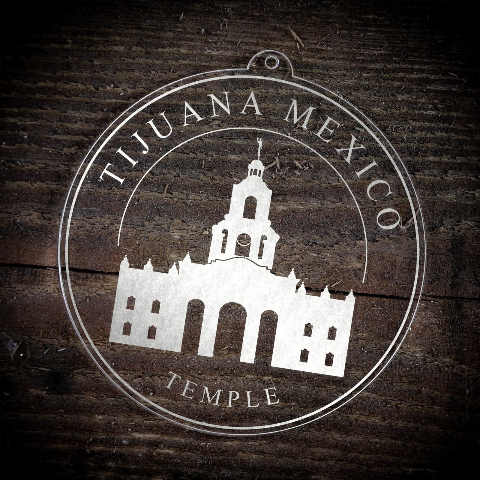Made out of a lightweight and very durable transparent acrylic, this ornament will not weigh your tree down and can definitely withstand being dropped by the little ones should they get too curious around the tree.  The acrylic is cut into a 4 inch circle and then laser etched with the name of the temple and a graphic depicting an artistic representation of the Tijuana Mexico Temple.
