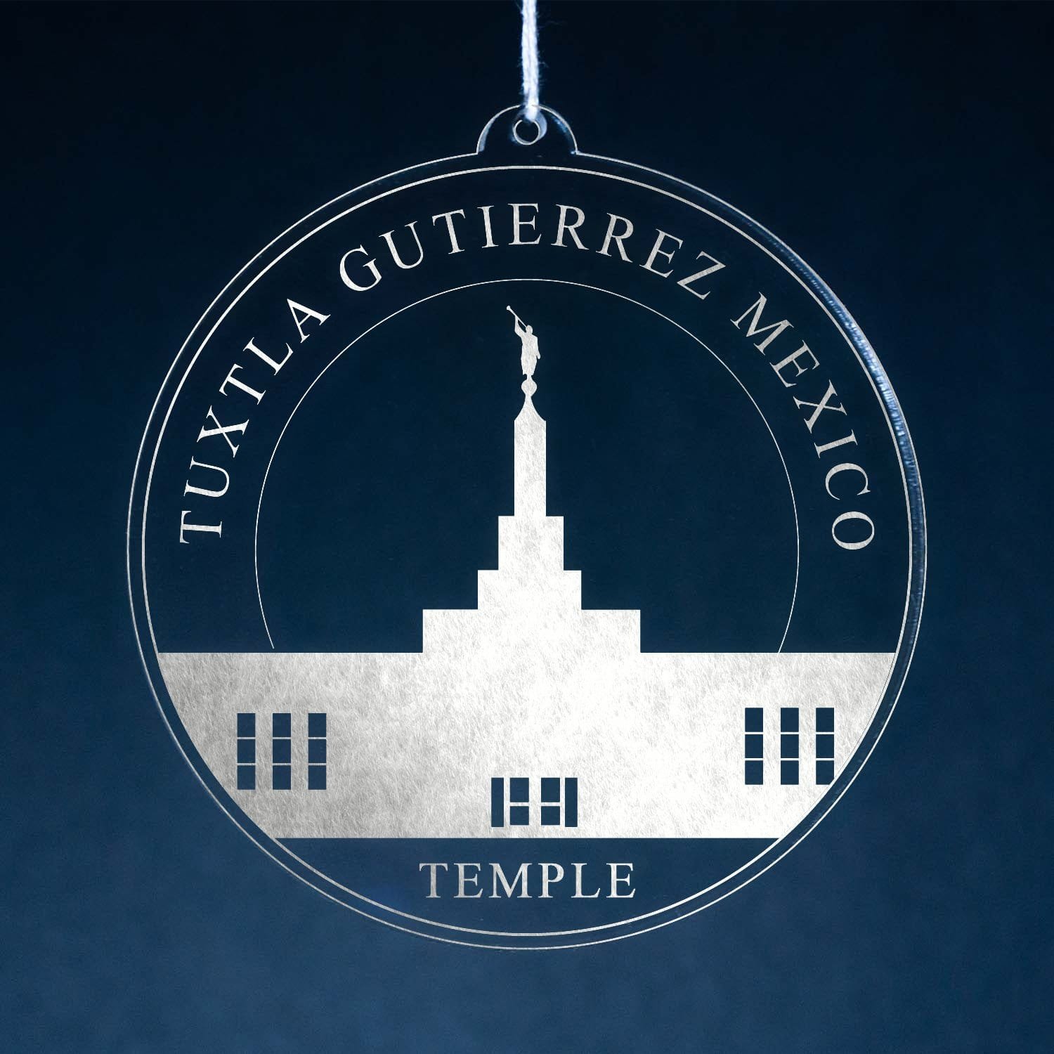 Made out of a lightweight and very durable transparent acrylic, this ornament will not weigh your tree down and can definitely withstand being dropped by the little ones should they get too curious around the tree.  The acrylic is cut into a 4 inch circle and then laser etched with the name of the temple and a graphic depicting an artistic representation of the Tuxtla Gutierrez Mexico Temple.