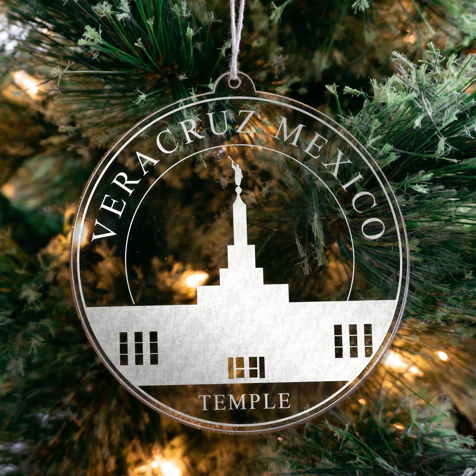 Made out of a lightweight and very durable transparent acrylic, this ornament will not weigh your tree down and can definitely withstand being dropped by the little ones should they get too curious around the tree.  The acrylic is cut into a 4 inch circle and then laser etched with the name of the temple and a graphic depicting an artistic representation of the Veracruz Mexico Temple.